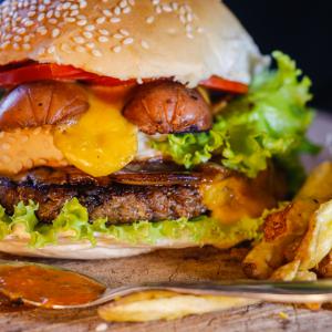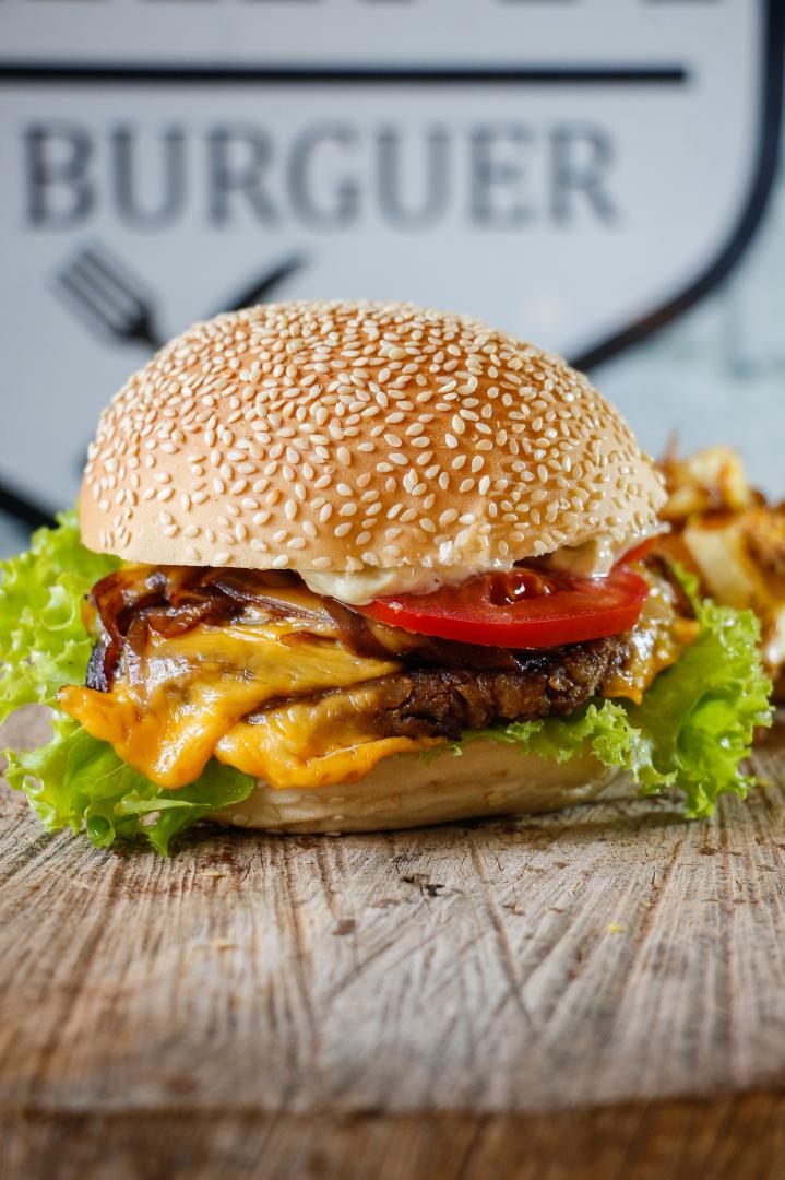 Hamburguer vegano, Linguiça defurmada acebolada, pão de hambúrguer artesanal com gergelim, guarnecido com duplo queijo prato, tomates fresco, alface orgânica e maionese da casa.