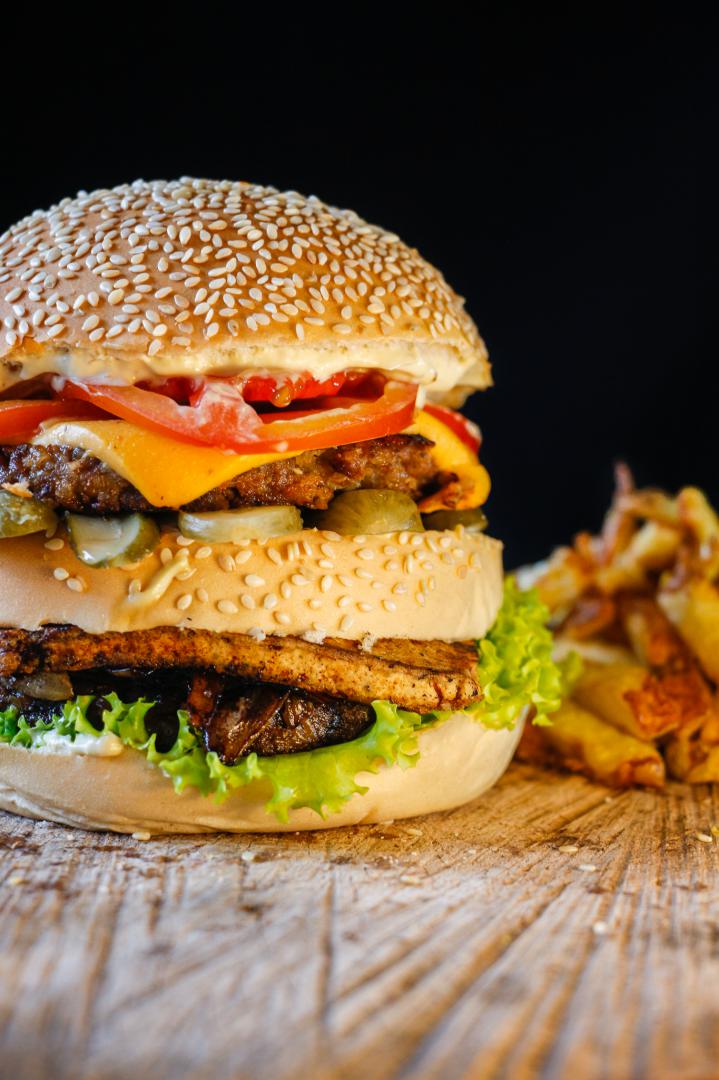 Duplo Burguer num pão de hamburguer com gergelim em tres camadas, cebola, queijo prato vegano da nomoo, tofú grelhado, maionese da casa, pickles, tomate e alface, tudo isso com bastante maionese da casa
