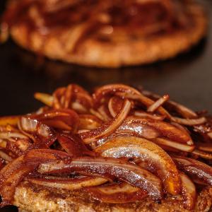 Hamburguer vegano no pão de hambúrguer artesanal com gergelim, guarnecido com tofú acebolado e maionese da casa.