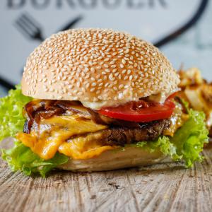 Duplo Burguer num pão de hamburguer com gergelim em tres camadas, cebola na chapa, queijo prato duplo, tomate, pickles, alface orgânica e bastante maionese da casa.