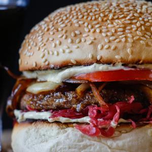 Hamburguer vegano, pão de hambúrguer artesanal com gergelim, guarnecido com queijo branco artesanal e cebola na chapa, Chucrute de repolho roxo, tomates fresco e maionese da casa com um toque de dijon.