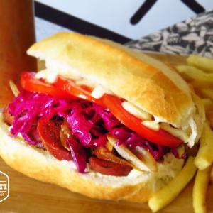 Linguiça veggie defumada e acebolada, chucrute (repolho roxo), tomates frescos maionese da casa, tudo num crocante pão francês.