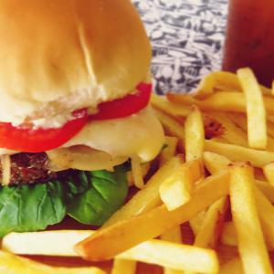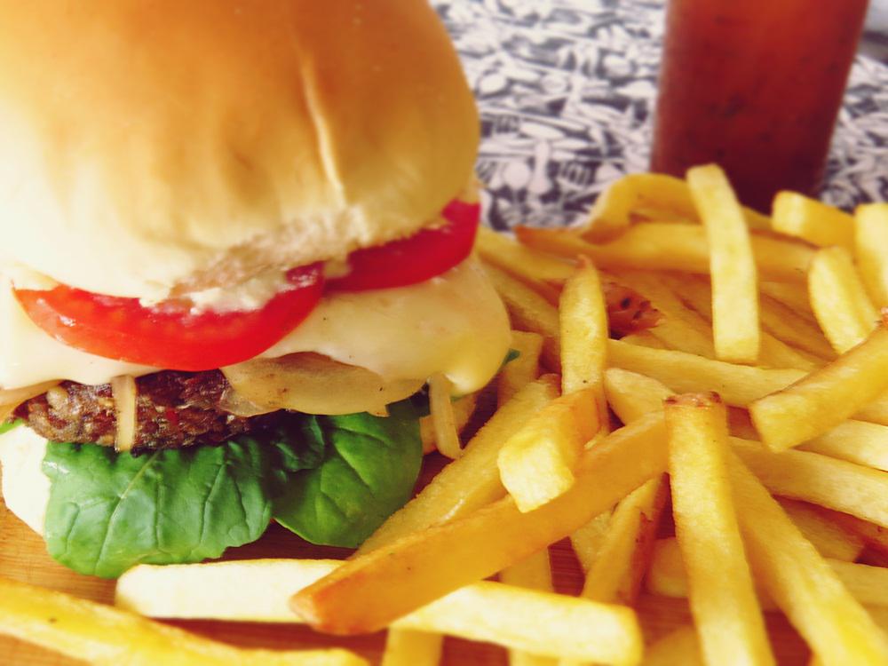 Hamburguer veg, pão de hambúrguer artesanal com gergelim, guarnecido com queijo prato, tomates frescos, maionese da casa com um toque de dijon, cebola na chapa e alface orgânica.